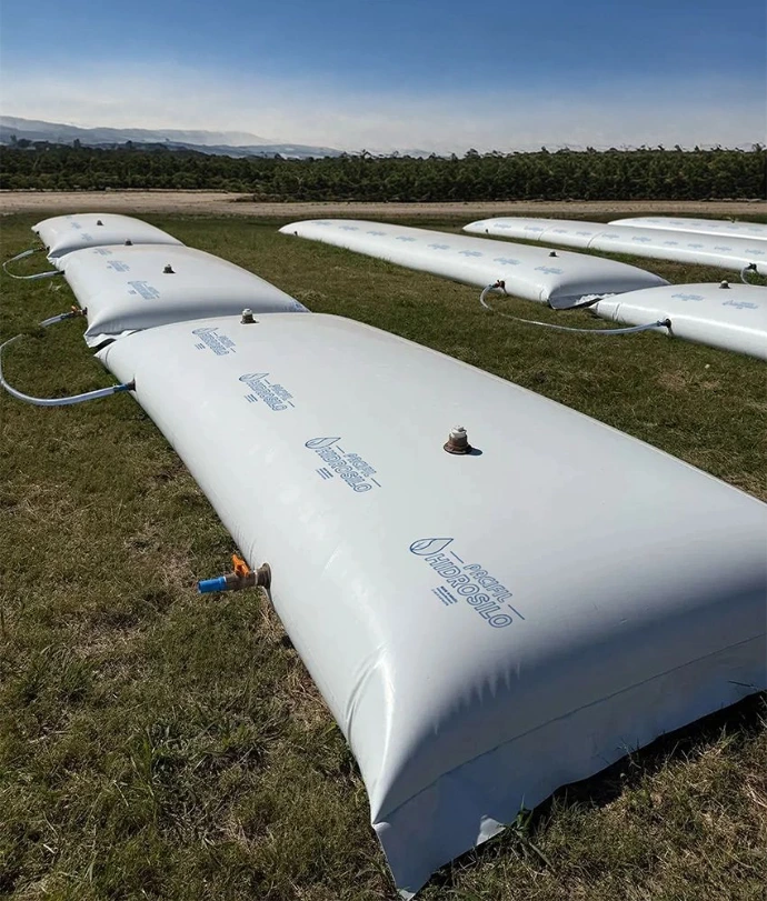 El hidrosilo es un tanque de agua flexible, con una forma similar a un silo-bolsa pero mucho más grueso y diseñado con materiales que protegen el agua de los rayos de luz para mantener intacta su calidad y evitar la formación de algas.